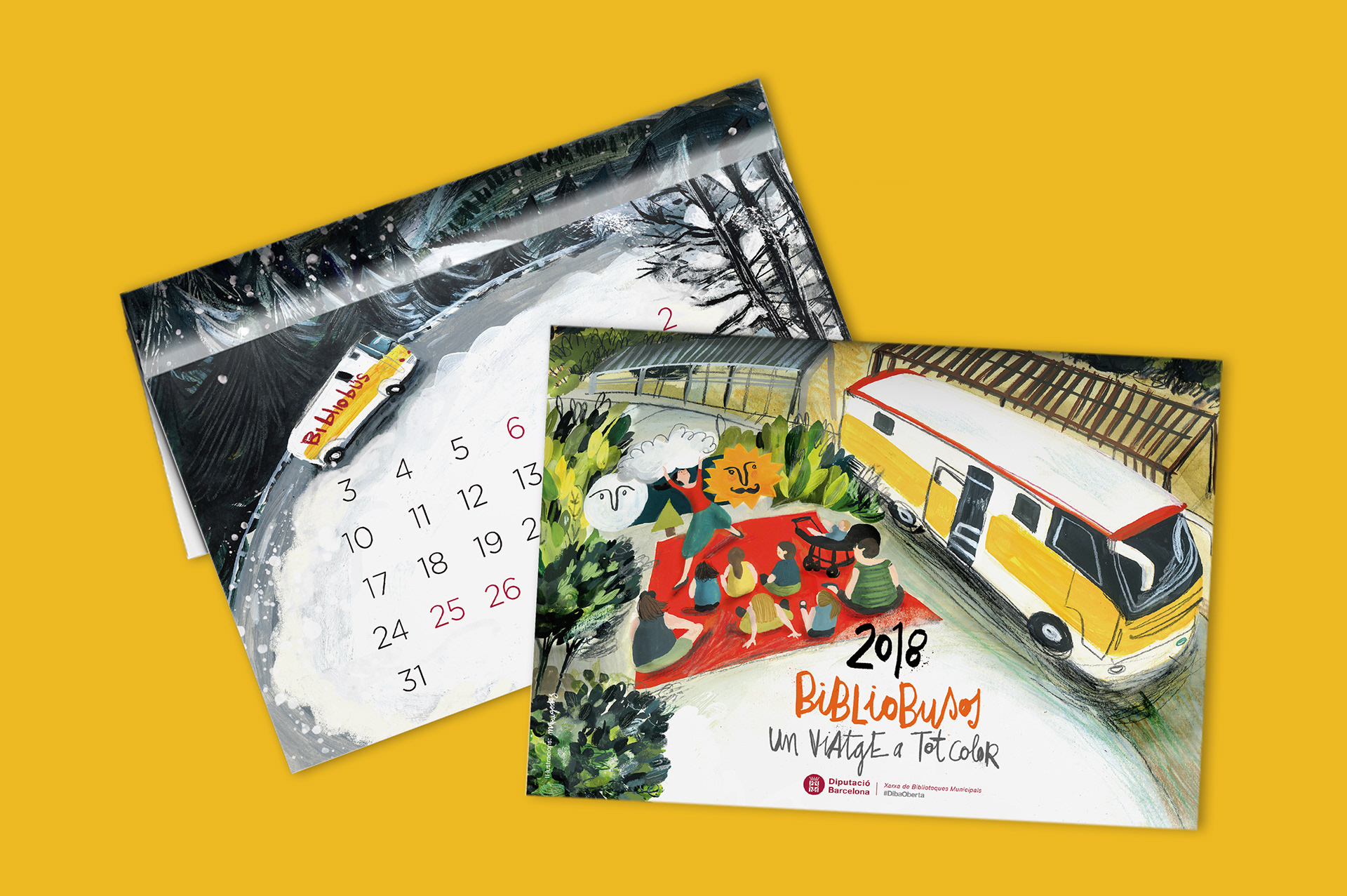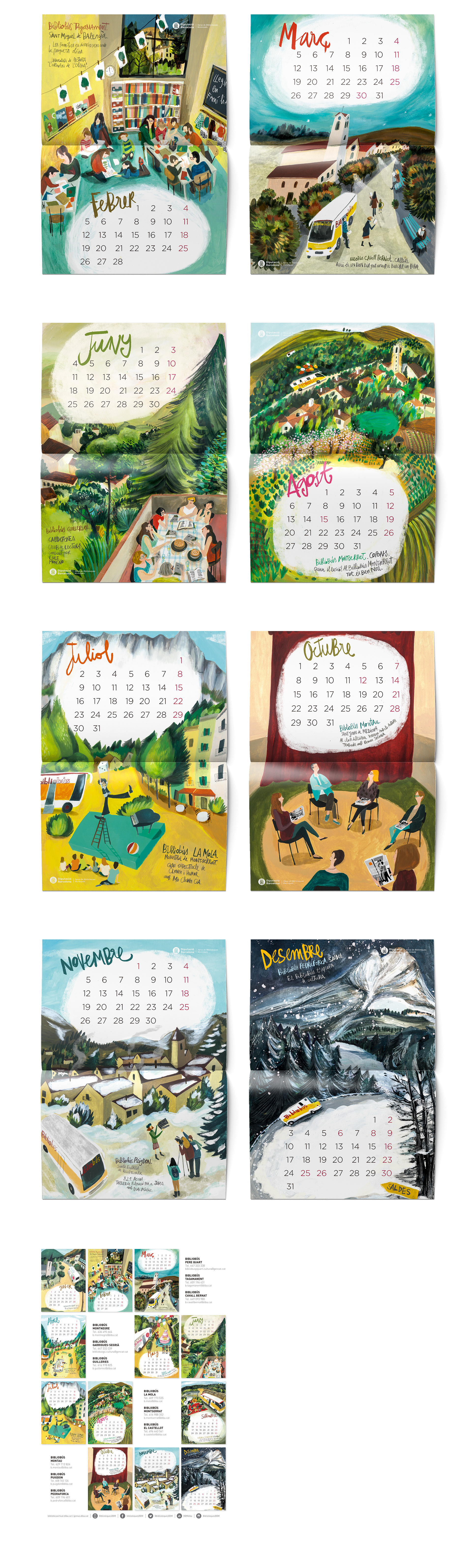 Calendar Bibliobús 2018. Diputació de Barcelona. I've made the illustrations, reflecting activities and places of bookmobiles routes through Barcelona province. Drawings are made with gouache and acrylic paint.