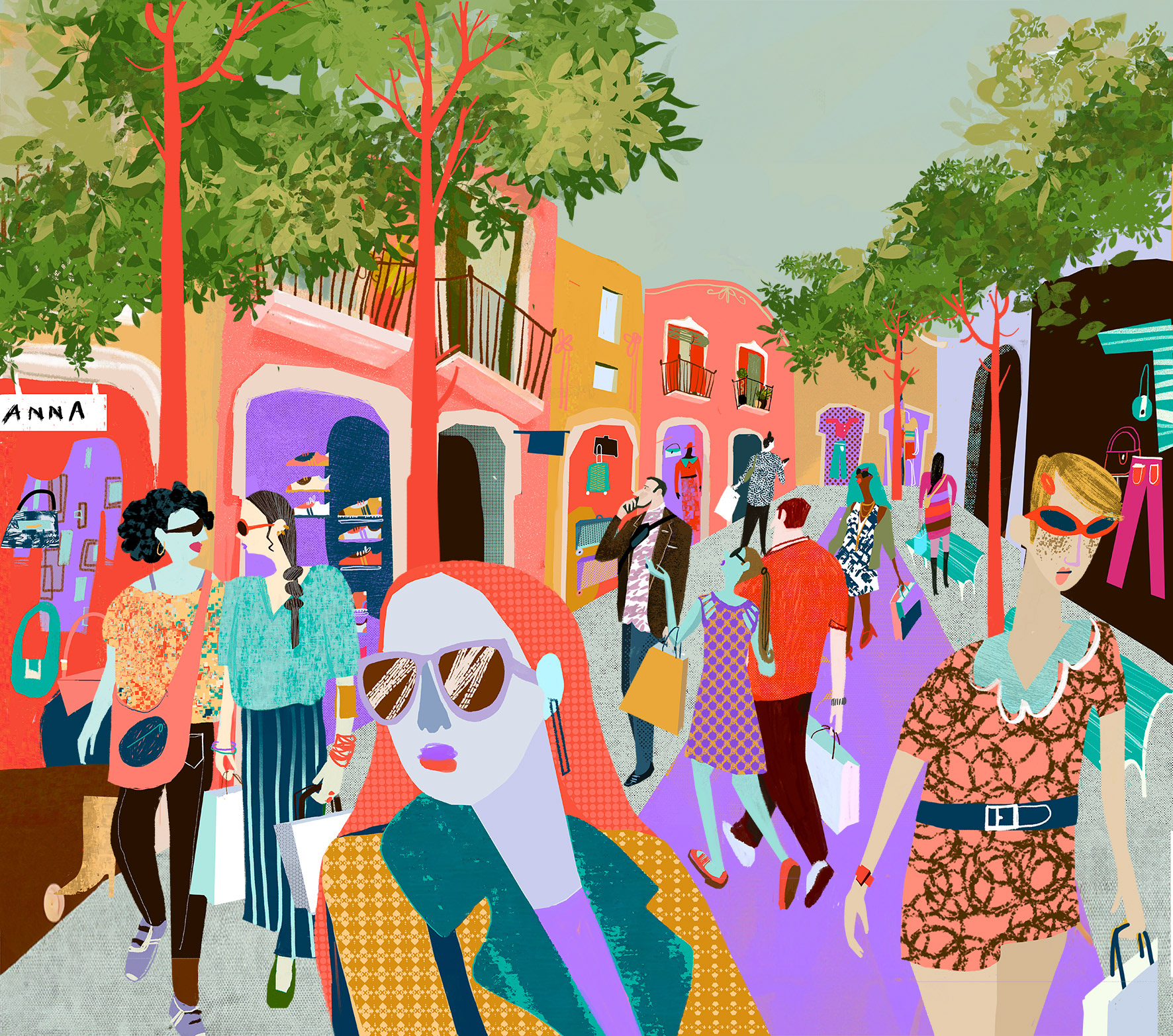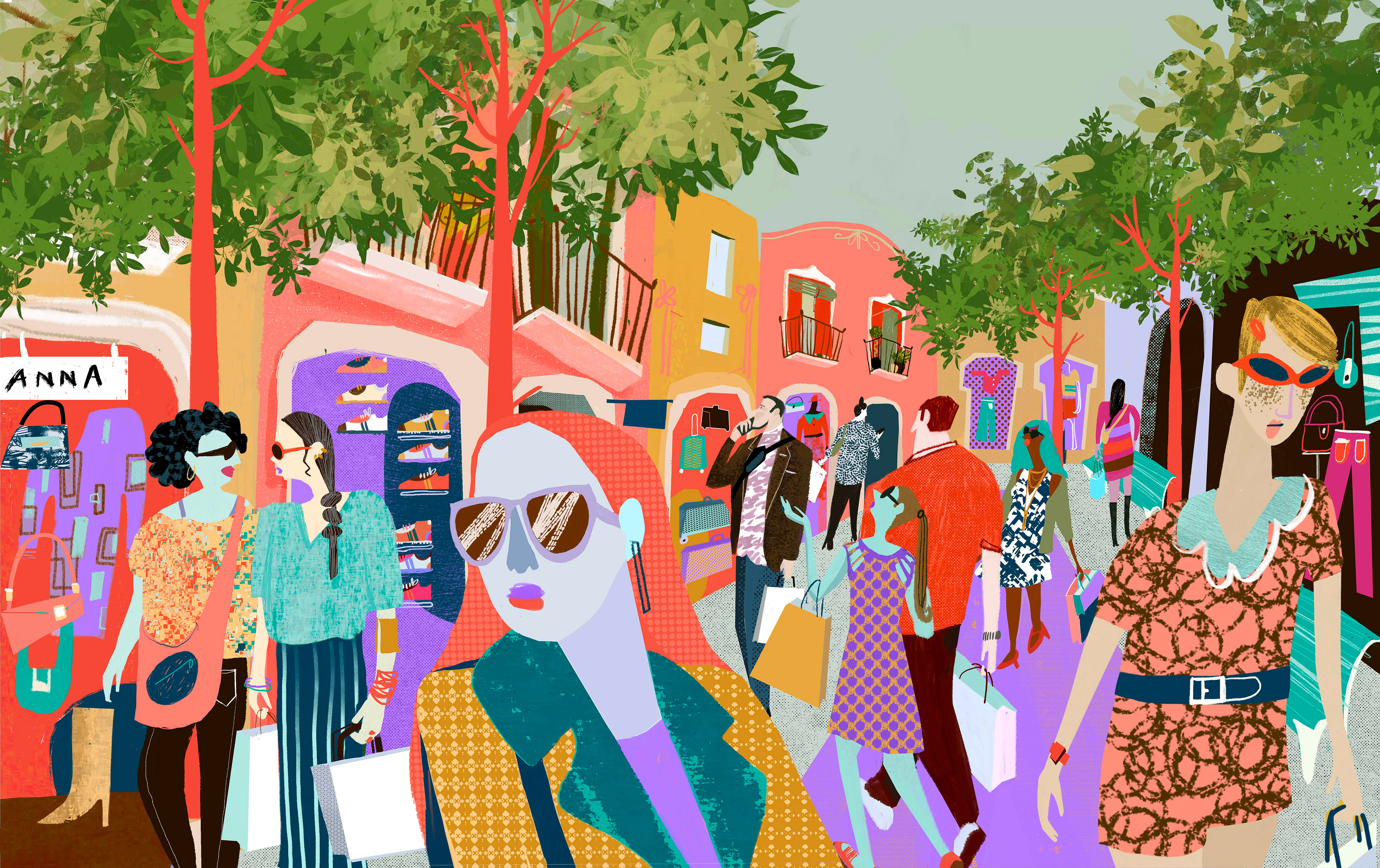 Double-page illustration created for the Sunday magazine of La Vanguardia, set in La Roca Village. In the scene, I bring together characters of different ages and backgrounds sharing the same space, building a diverse image shaped through color. I developed the piece digitally (from iPad to Adobe Photoshop) working with color in a direct, non-naturalistic way, using it as a tool for visual construction. The composition creates a sense of continuity and rhythm, guiding the viewer’s eye through the scene.
