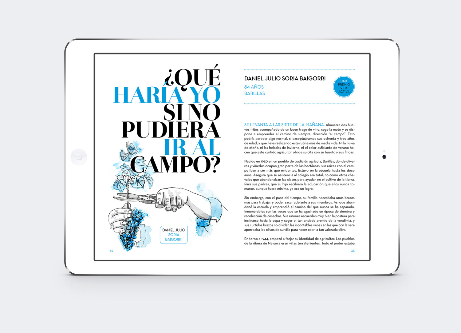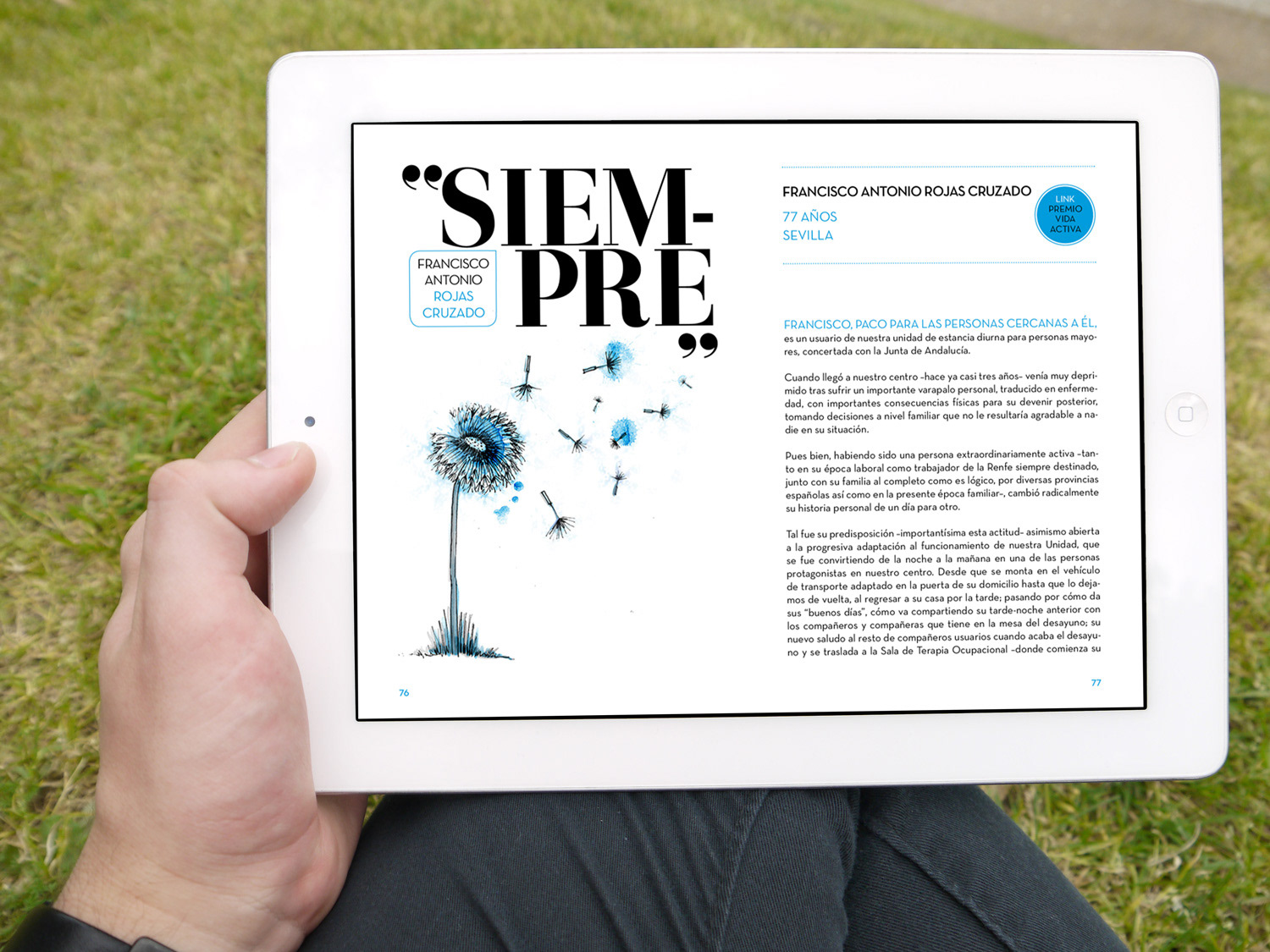 This ebook is a compilation of 20 stories of people over 65 who have overcome significant challenges after retirement. I created design, artwork and interactivity. Illustrations are drawn and colored by hand, retouching in Adobe Photoshop.