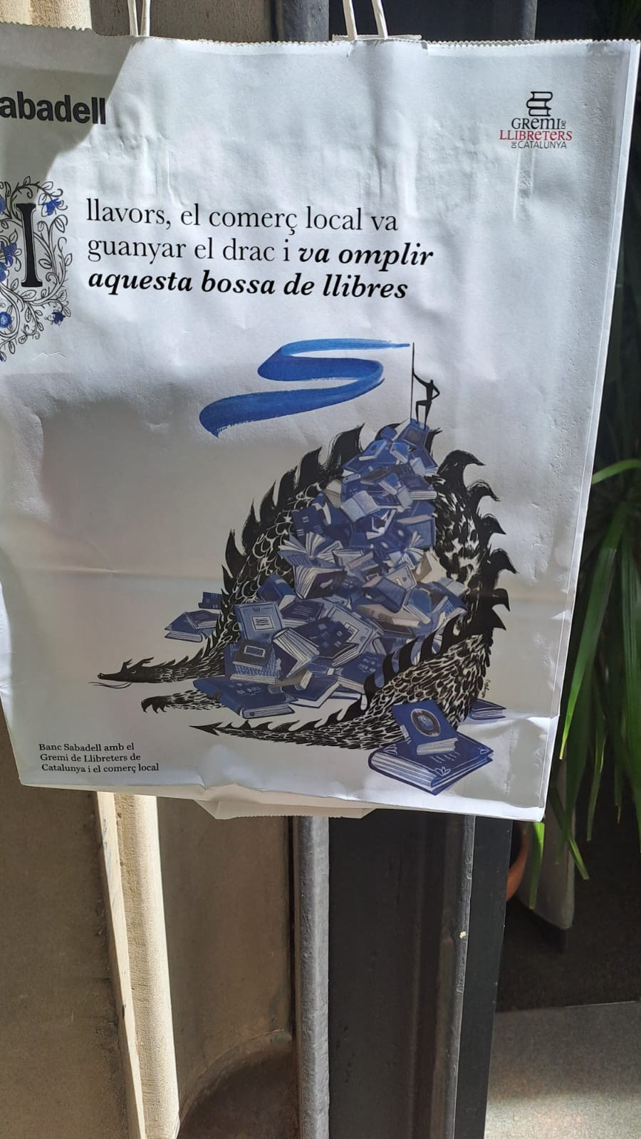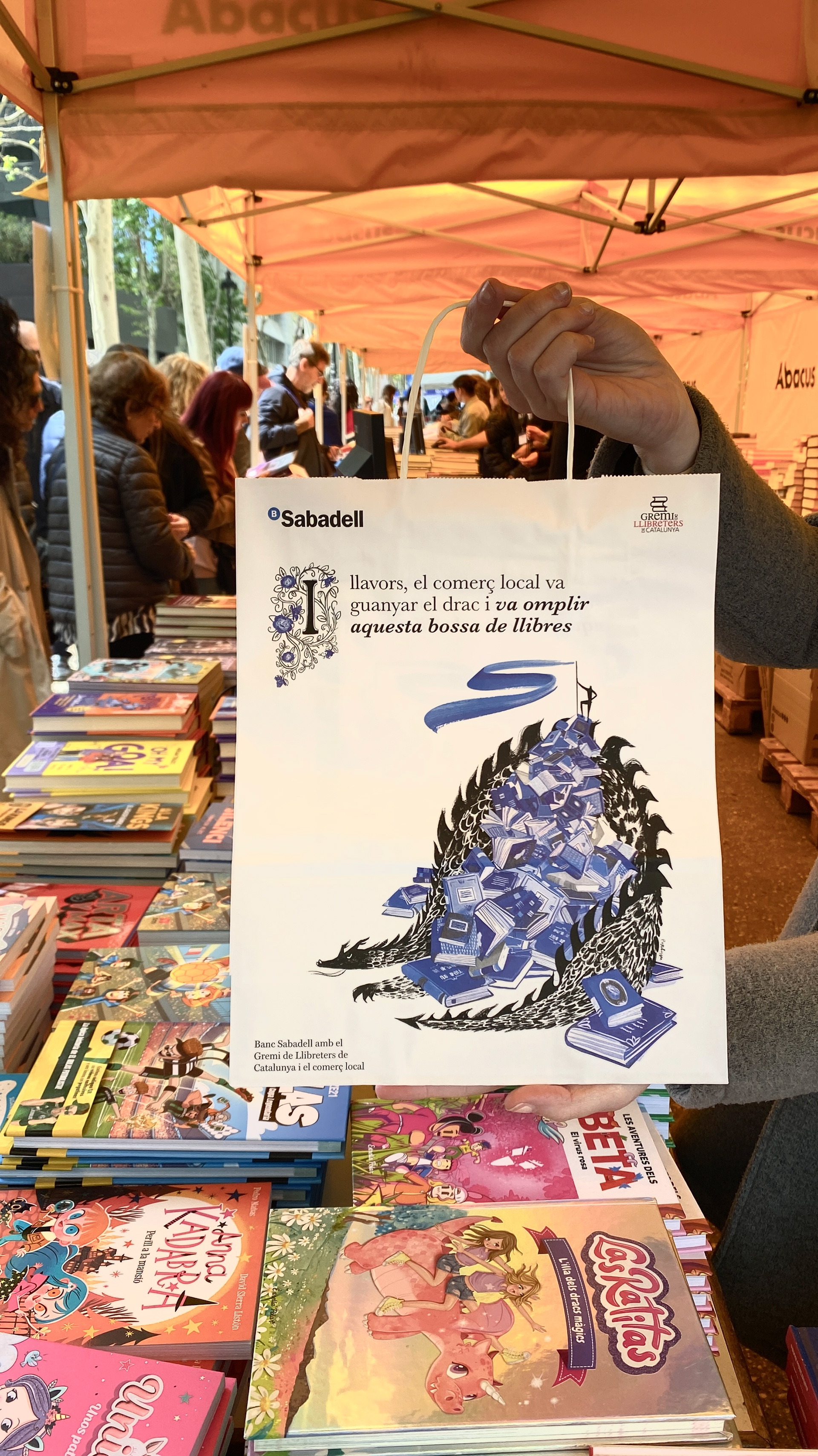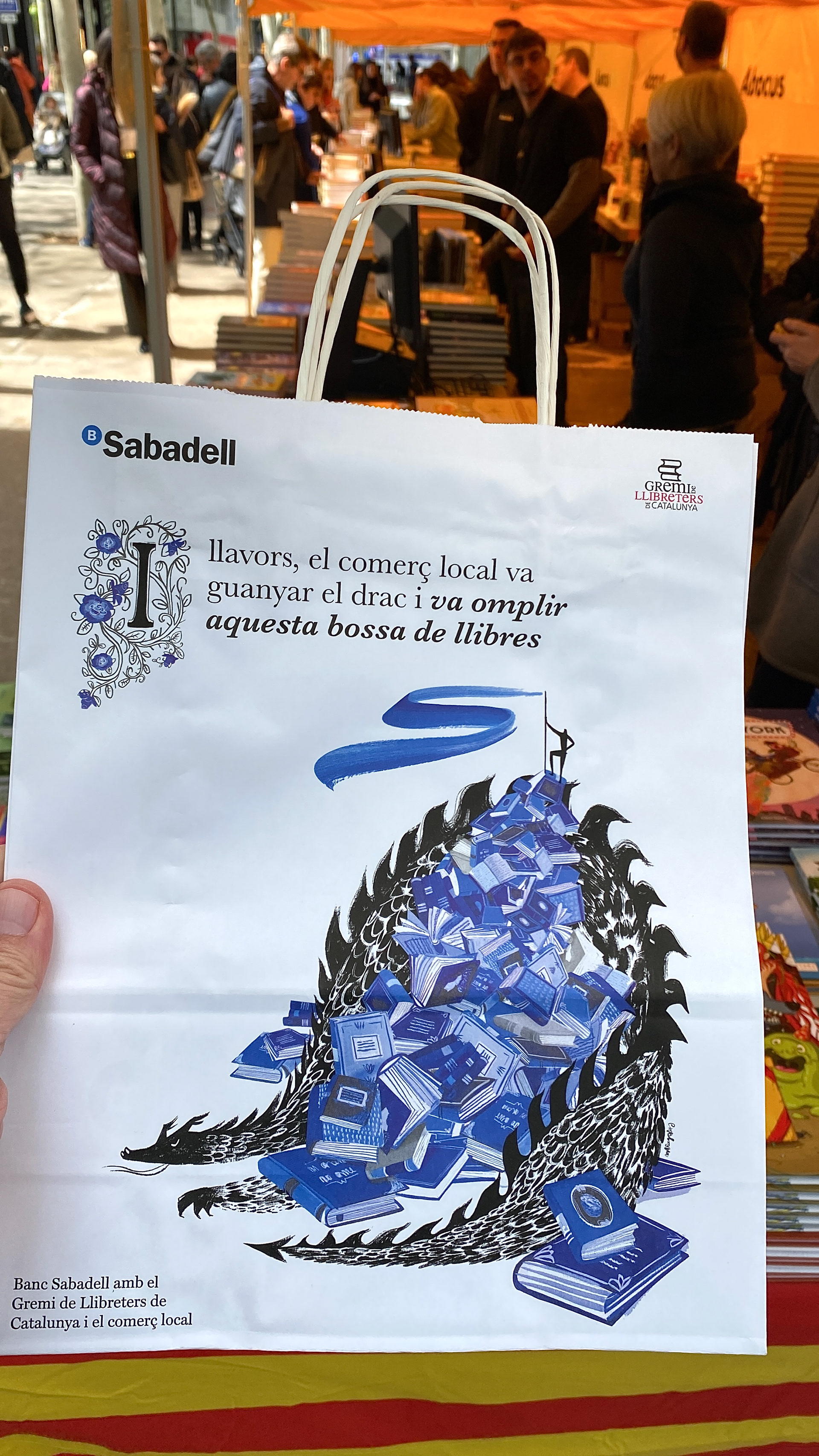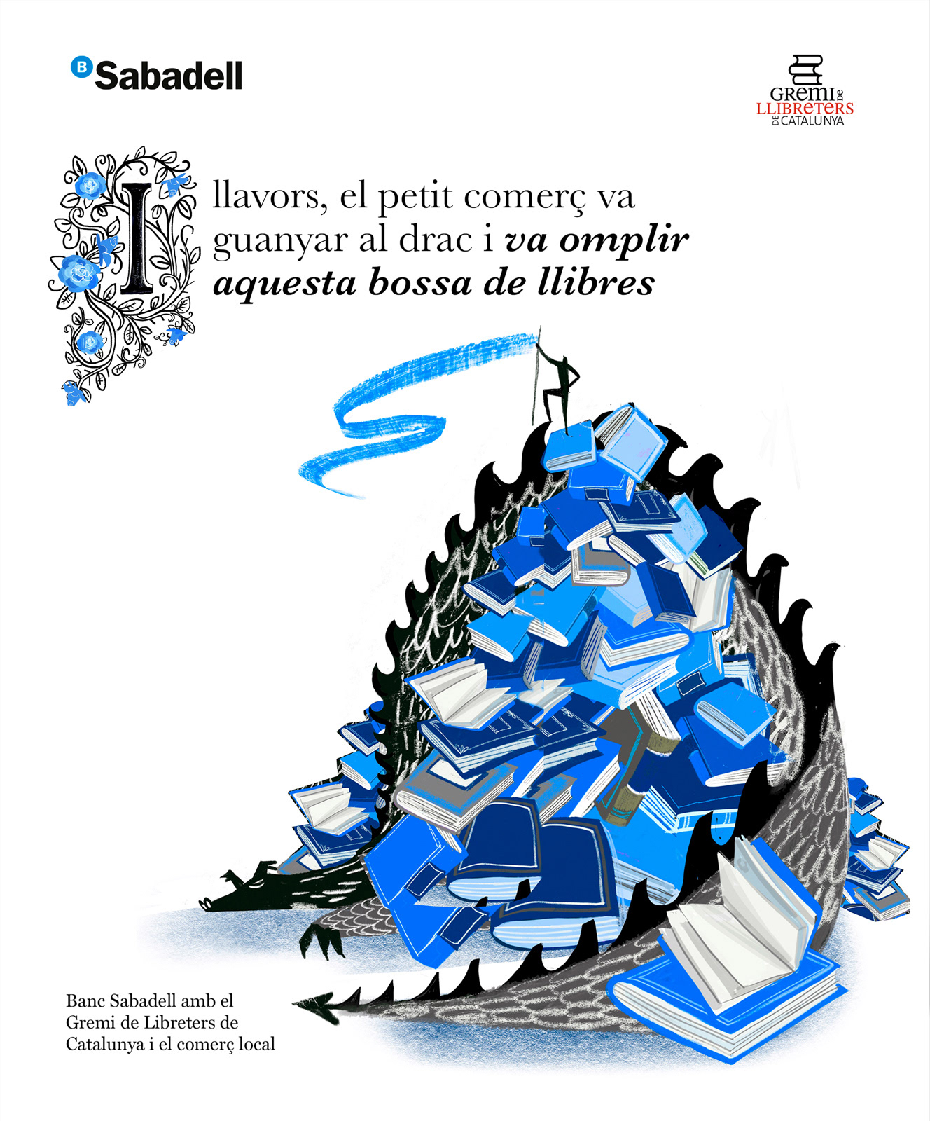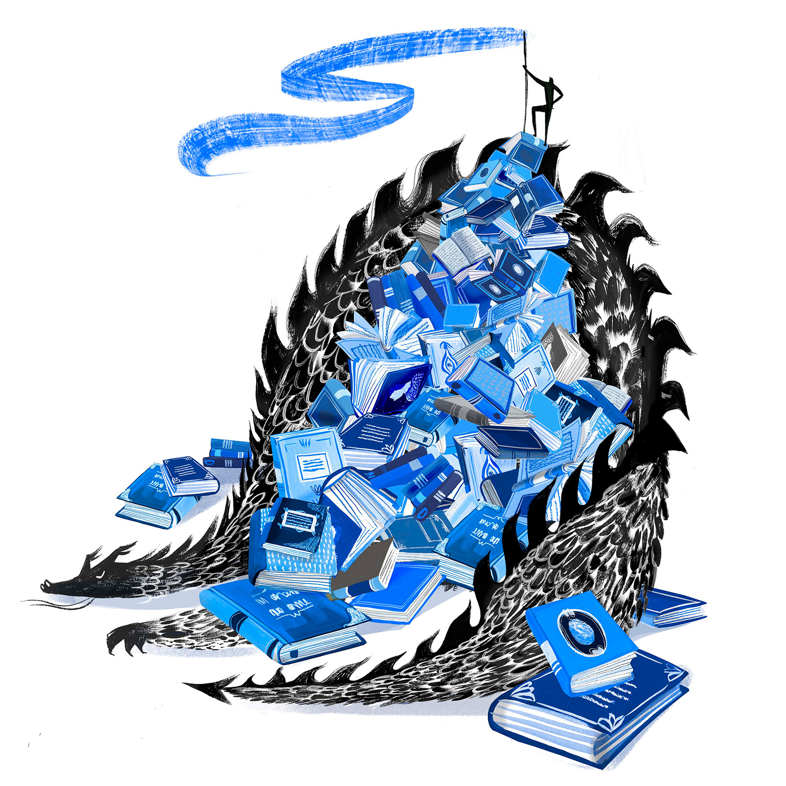 This illustration was created for the design of a paper bag intended for book sales during Sant Jordi, one of the most important cultural celebrations in Catalonia. The bag is part of the material used by the booksellers’ guild for this occasion. The commission was supported by Banco Sabadell, together with the booksellers’ guild and in collaboration with Mushroom Agency. The image presents an allegorical scene in which a dragon lies buried under books, symbolizing its defeat through literature, in a reference to the legend of Sant Jordi. At the top, a figure (a bookseller, author, or book lover) embodies the power of words and culture. The illustration was made in gouache with digital retouching, using exclusively Banco Sabadell’s corporate colors, in shades of blue and black.