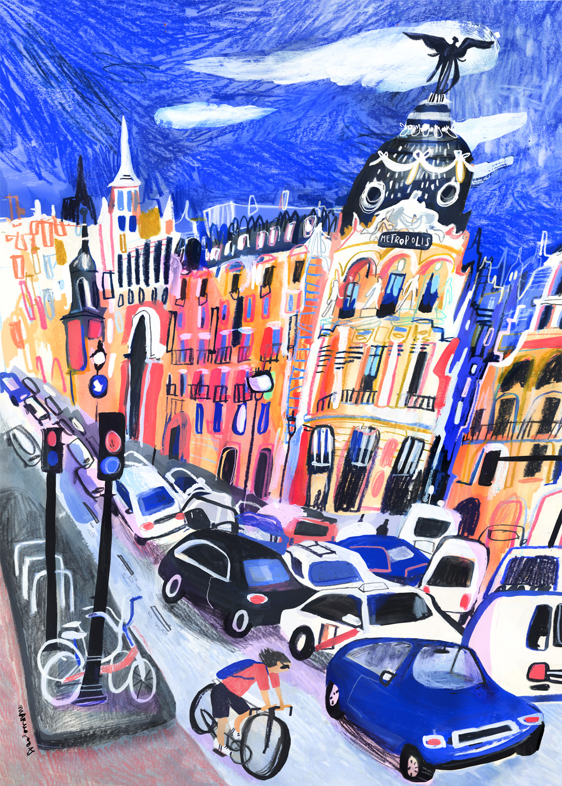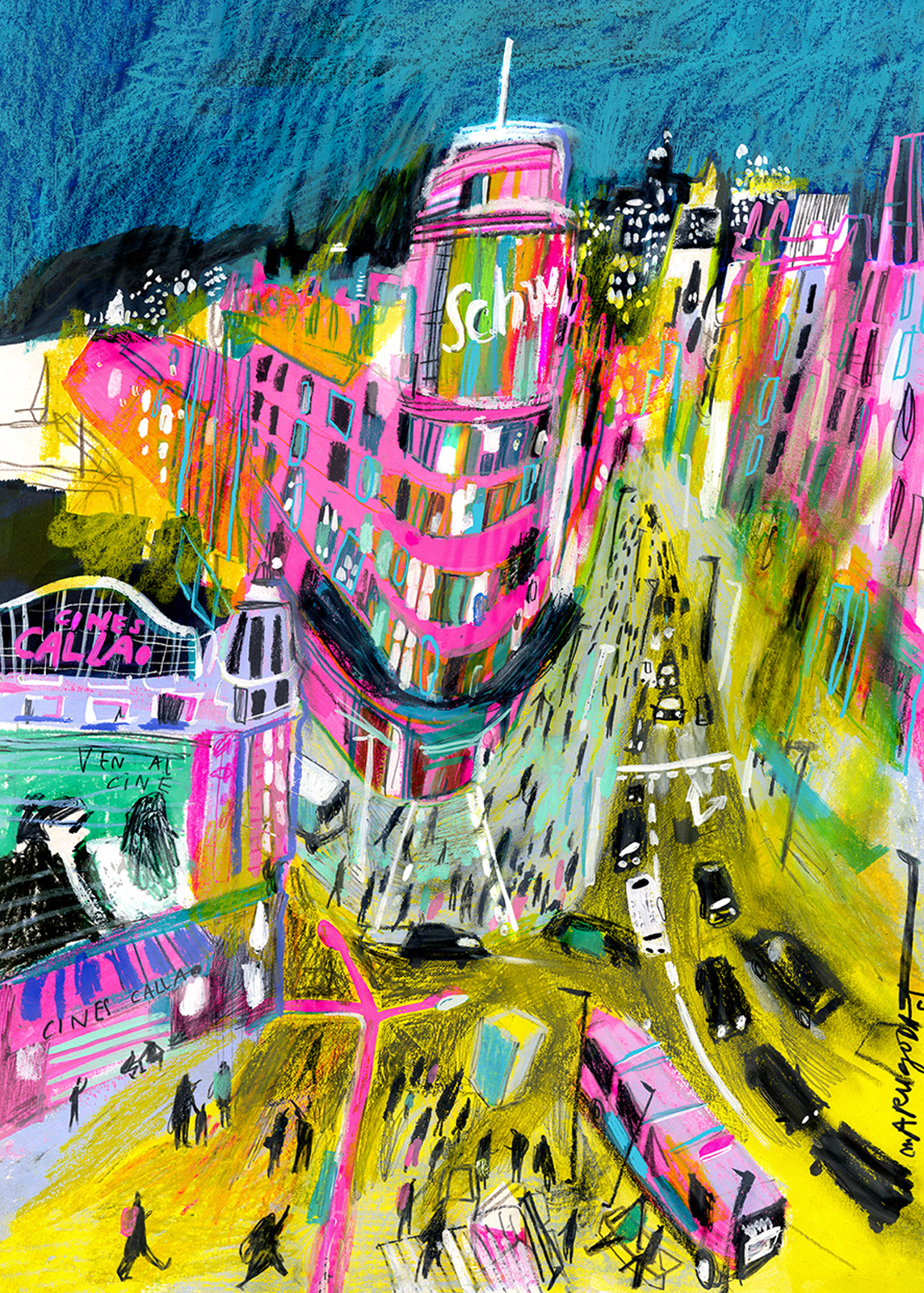 Sketching Madrid. Part 1 A series of drawings created in situ across different locations in Madrid, later developed and refined in the studio as part of an urban illustration project. In this series, I focus on iconic landmarks such as the Callao Cinemas and the Metrópolis Building, aiming to capture the vibrant, colorful, and dynamic energy of the city. The pieces are primarily executed in gouache, combined with mixed media techniques such as colored pencils, wax crayons, and other graphic materials, seeking an expressive balance between direct observation and artistic interpretation. Prints available for purchase: https://elmodernogallery.com/collections/maru-godas