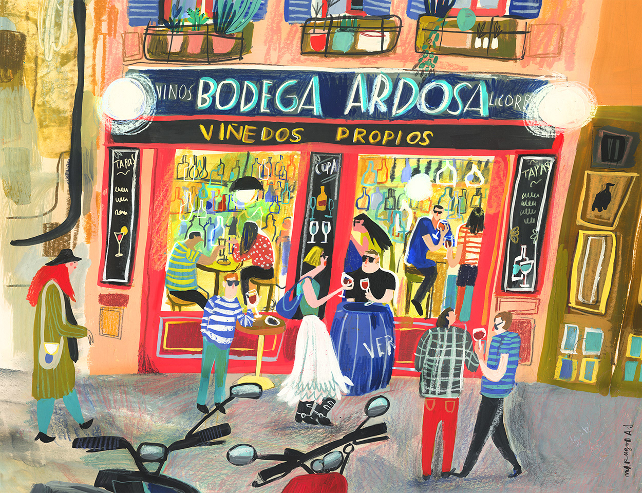 Sketching Madrid 2 Series focused on Madrid’s tapas culture and social atmosphere. The project examines traditional taverns, with particular attention to Bodega de la Ardosa. It includes both group dining scenes and close-up still-life compositions. The pieces are created using gouache, collage, color pencil and mixed media techniques.