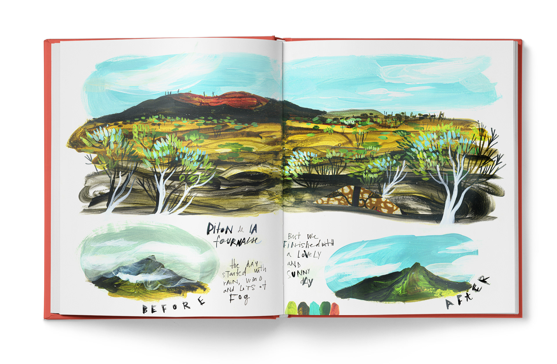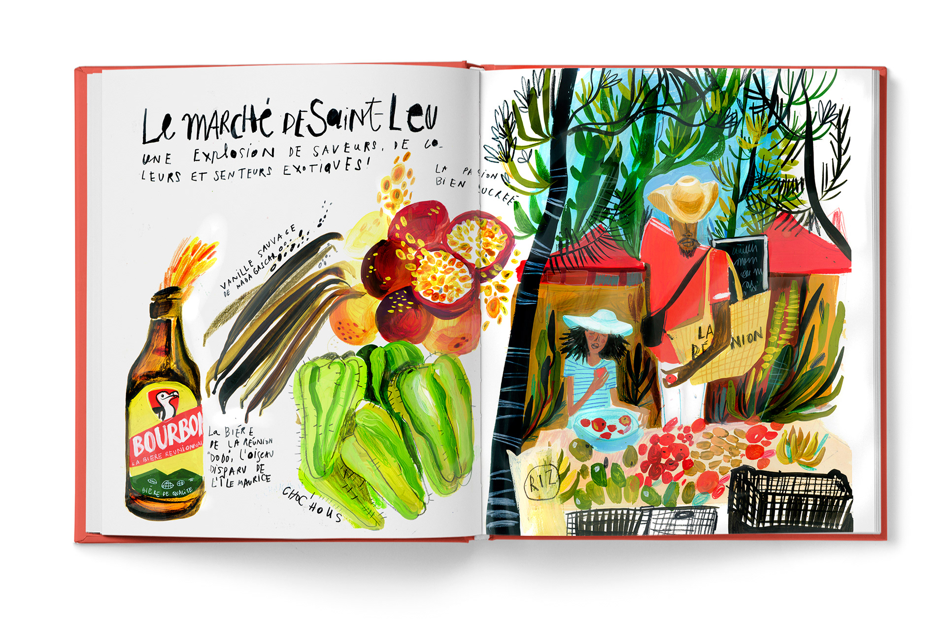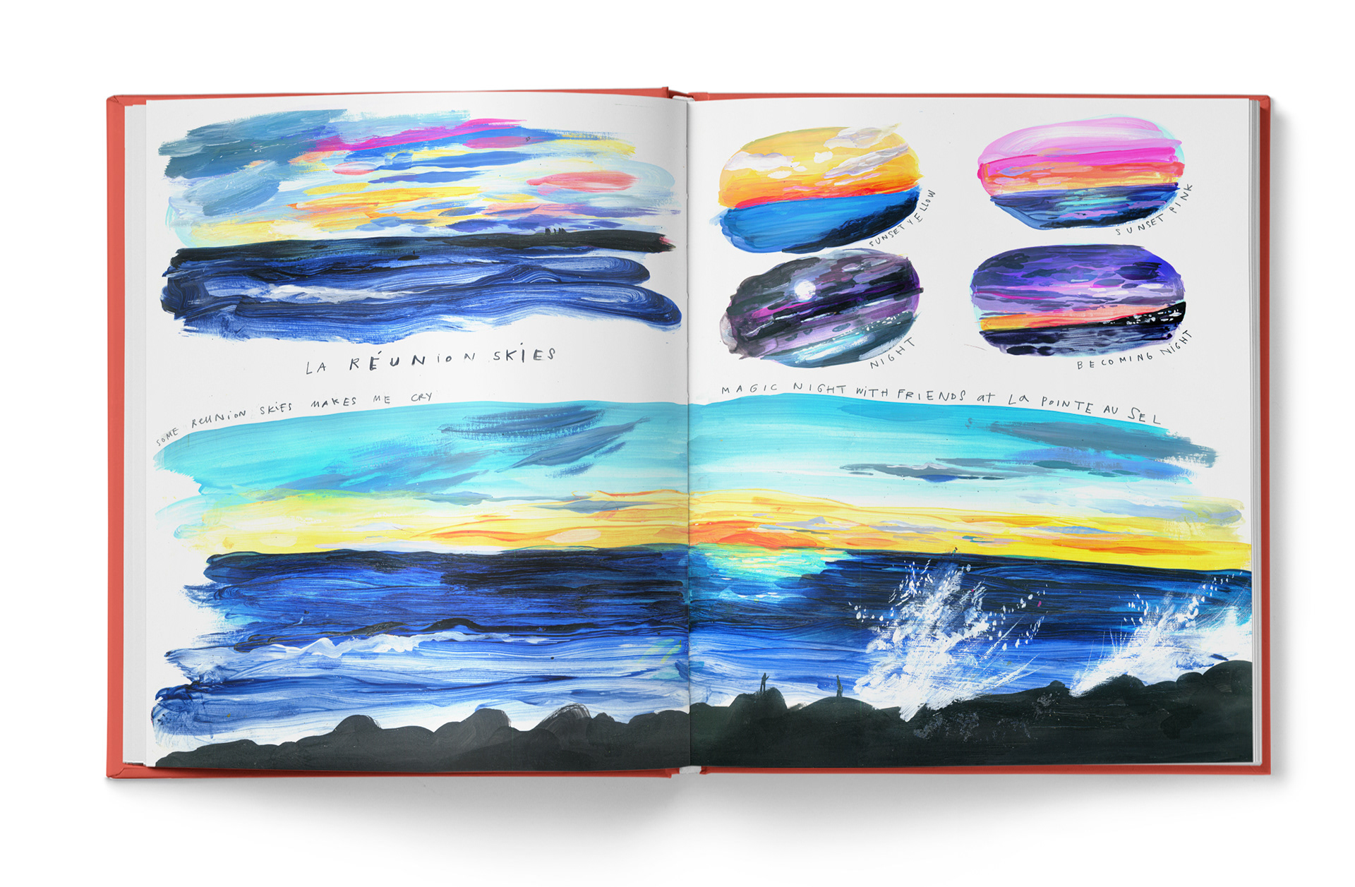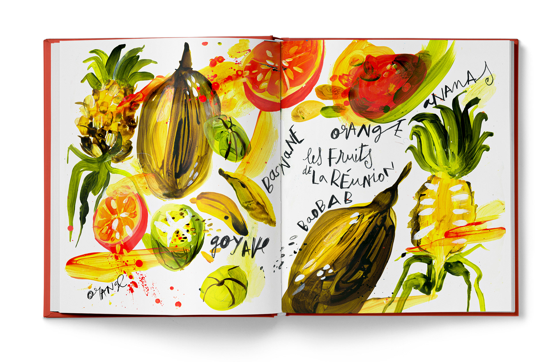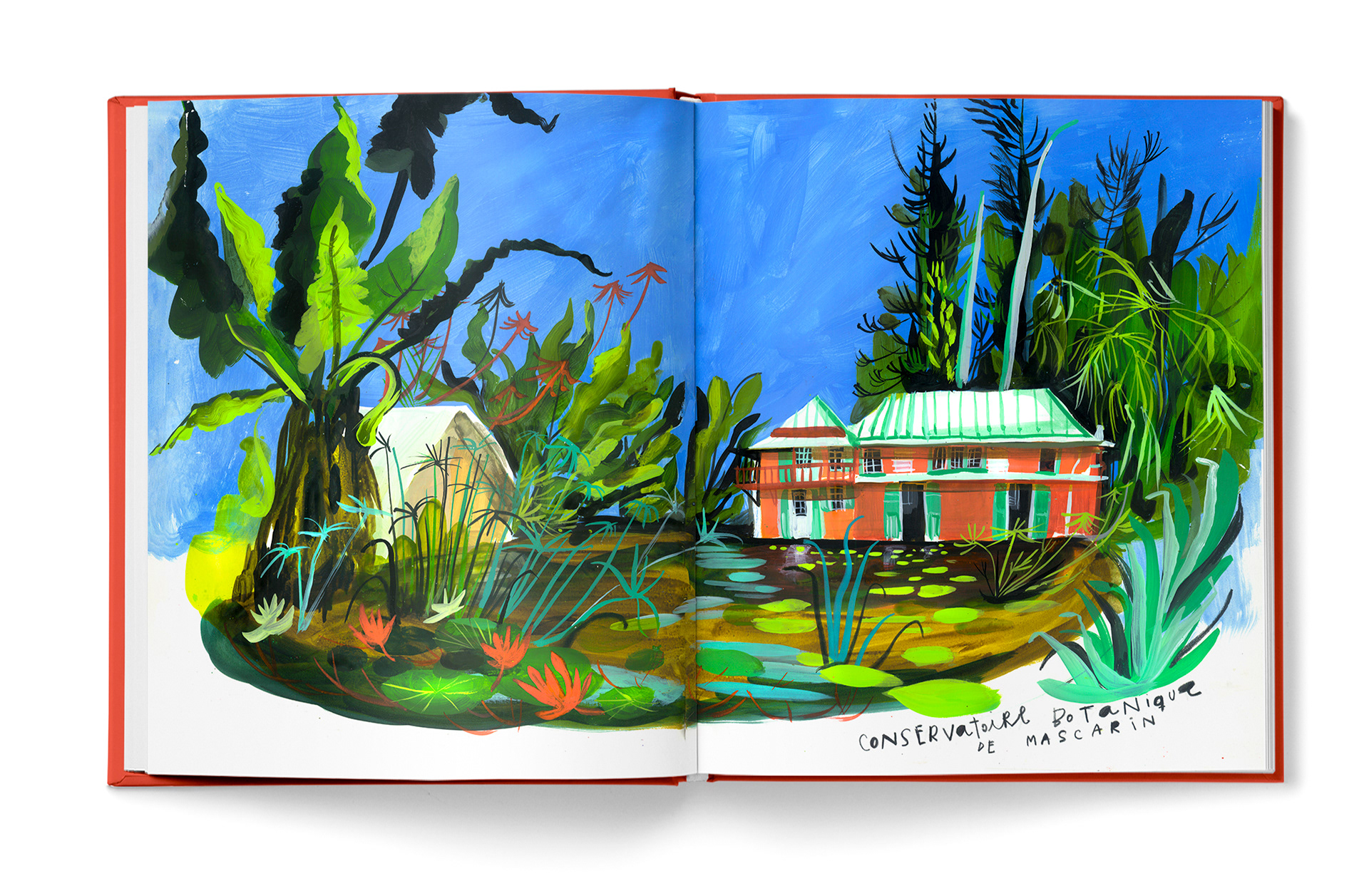 The drawings are based on direct observation: landscape, people, markets, the island’s colors, plants from the species conservatory, a créole house, fruits, the excursion to Îlet Boulon, and the Piton de la Fournaise volcano. There is also a double spread dedicated to the skies, which are especially intense and constantly changing.