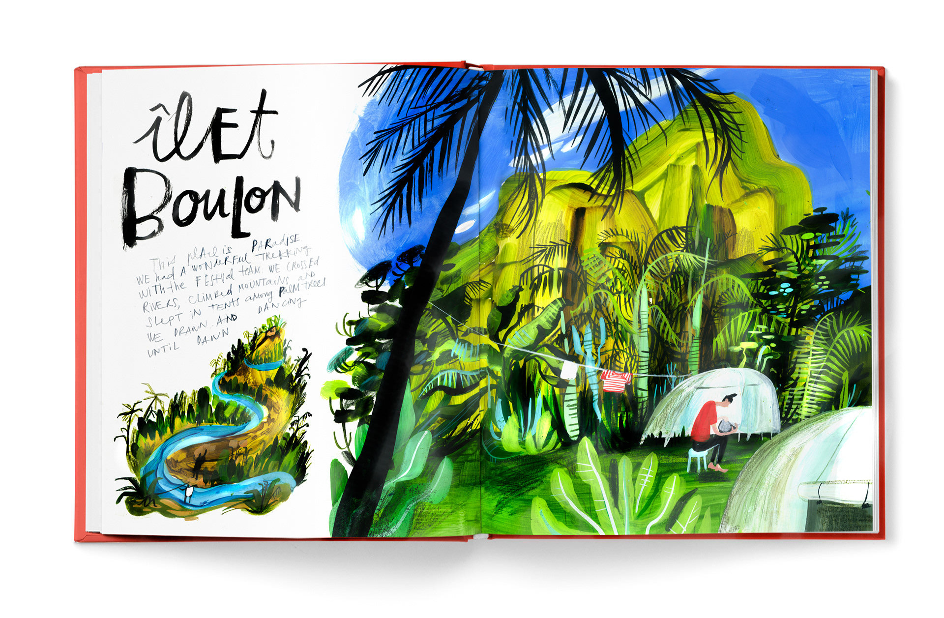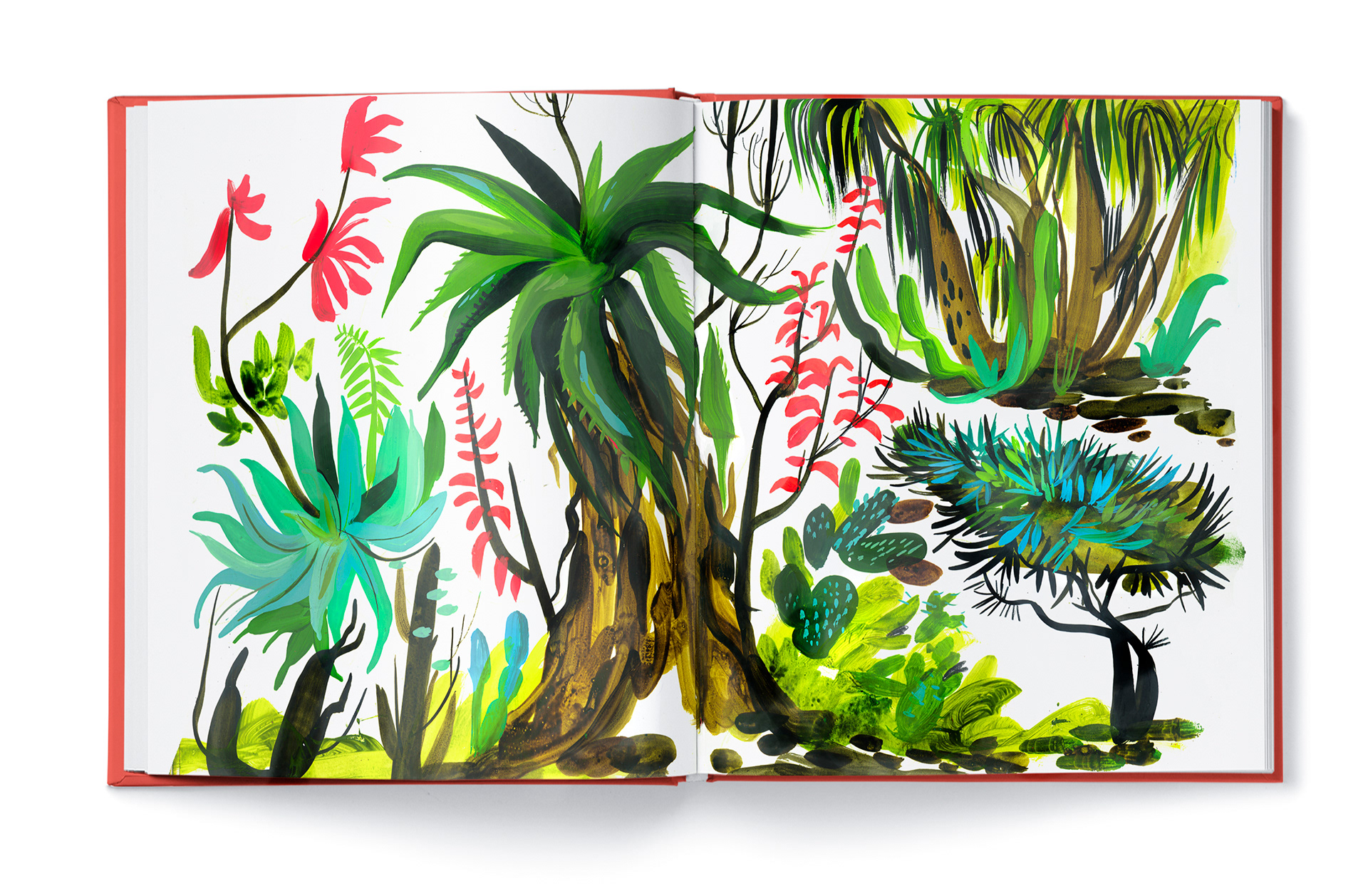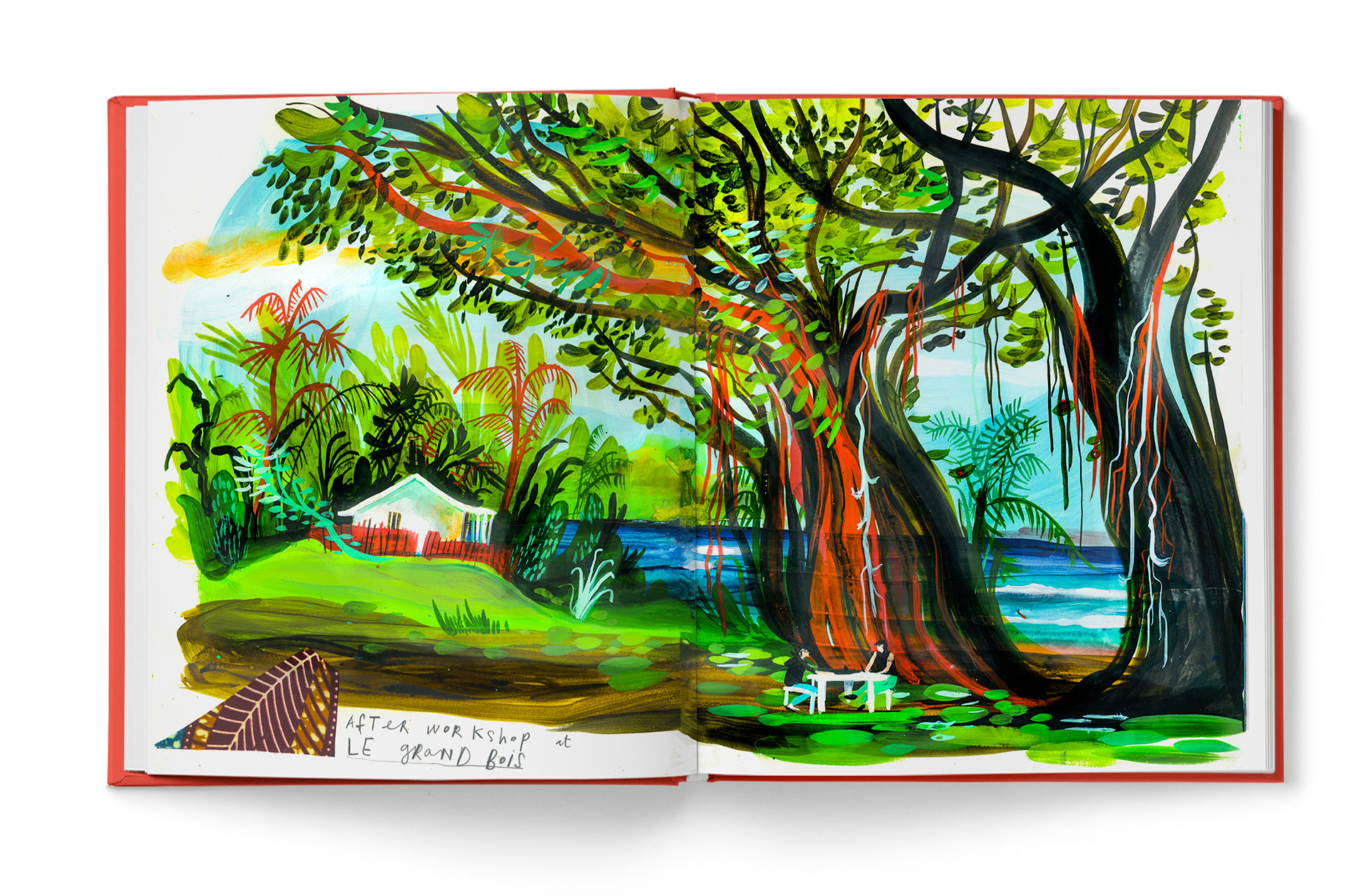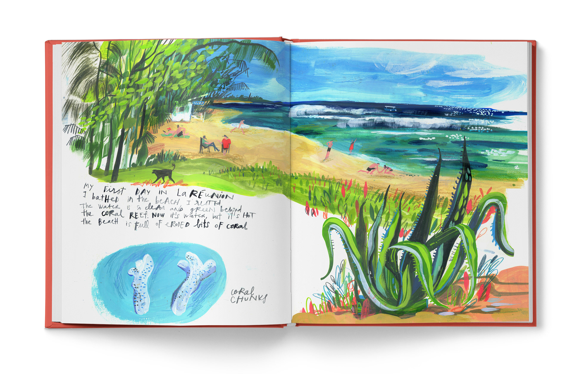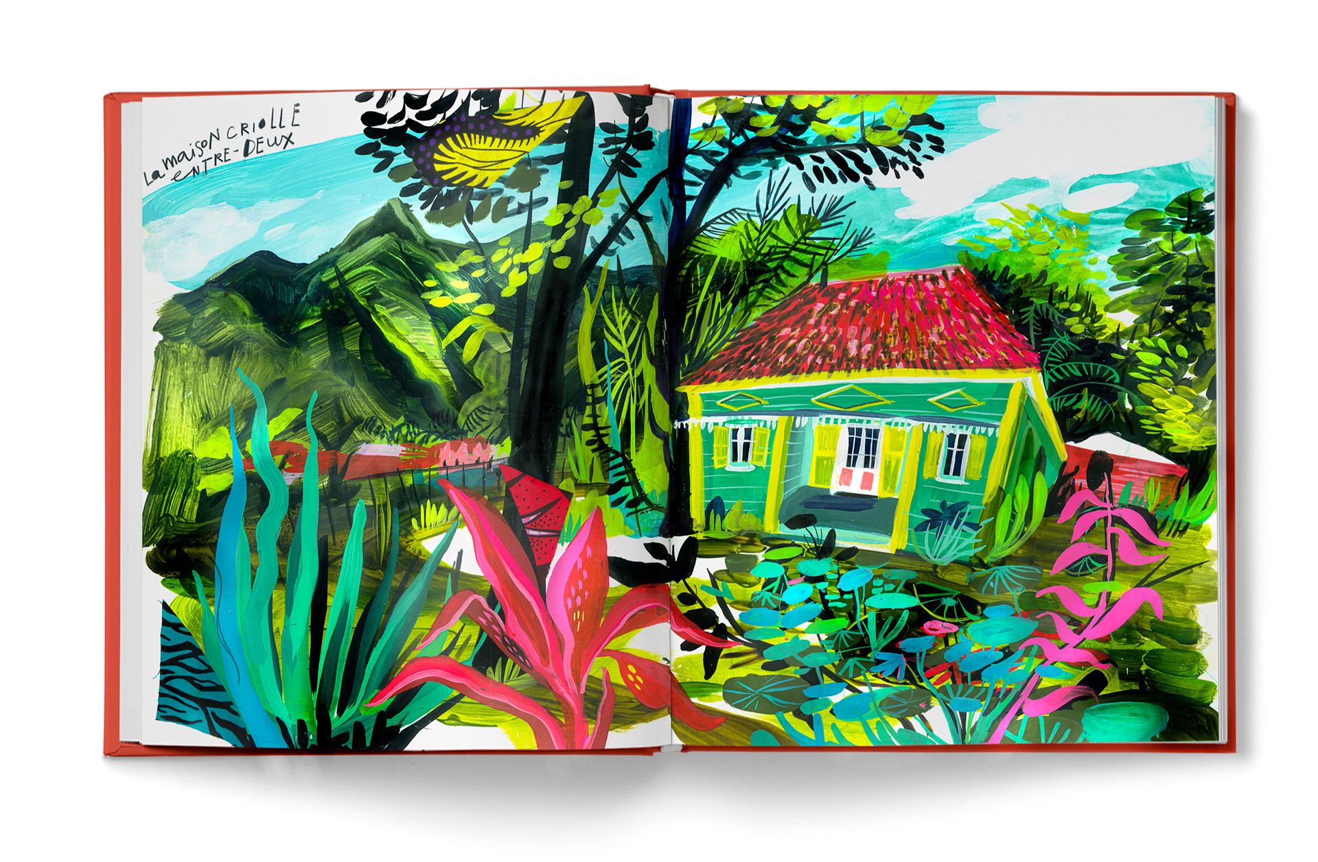 The drawings are based on direct observation: landscape, people, markets, the island’s colors, plants from the species conservatory, a créole house, fruits, the excursion to Îlet Boulon, and the Piton de la Fournaise volcano. There is also a double spread dedicated to the skies, which are especially intense and constantly changing.