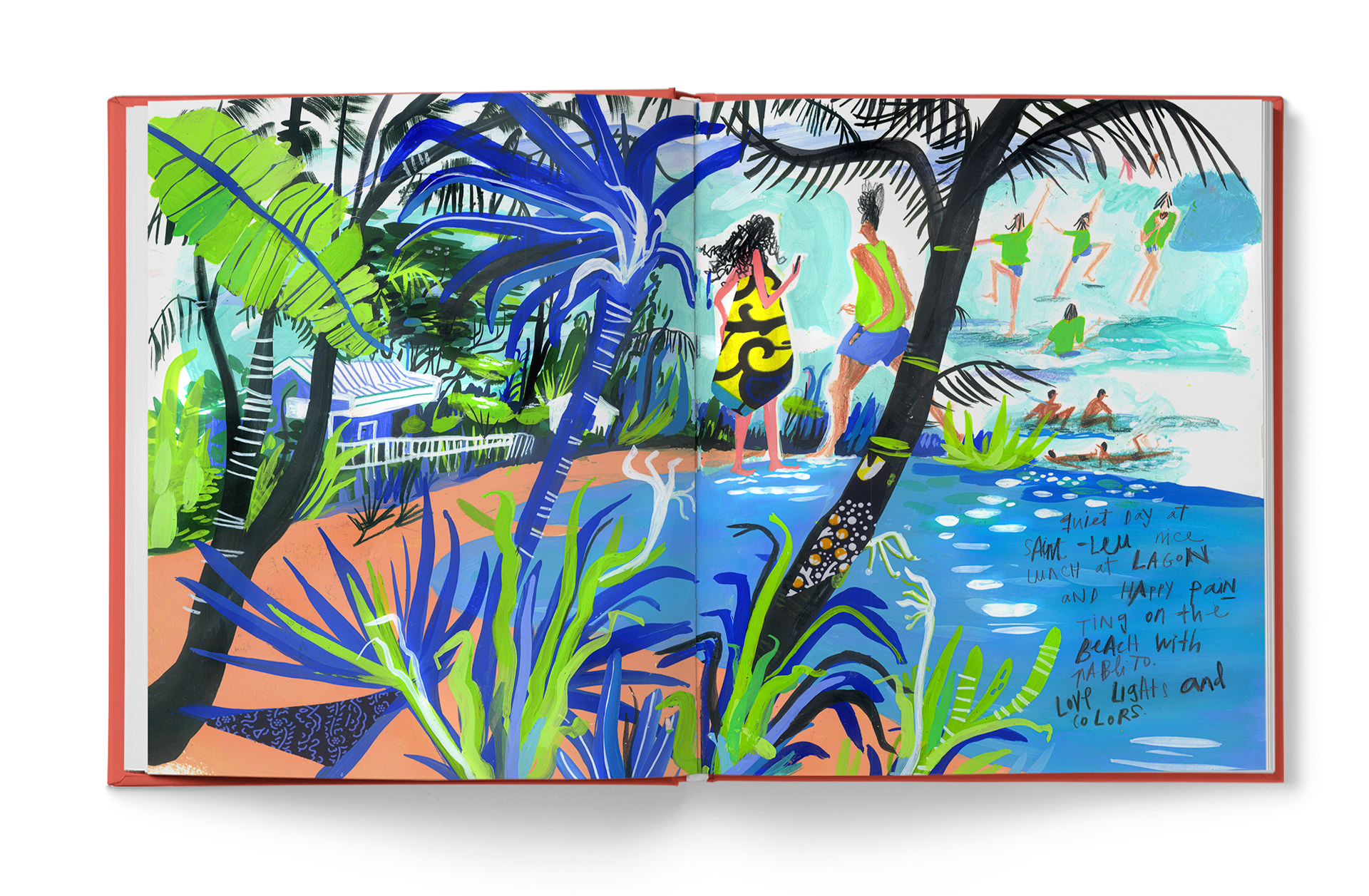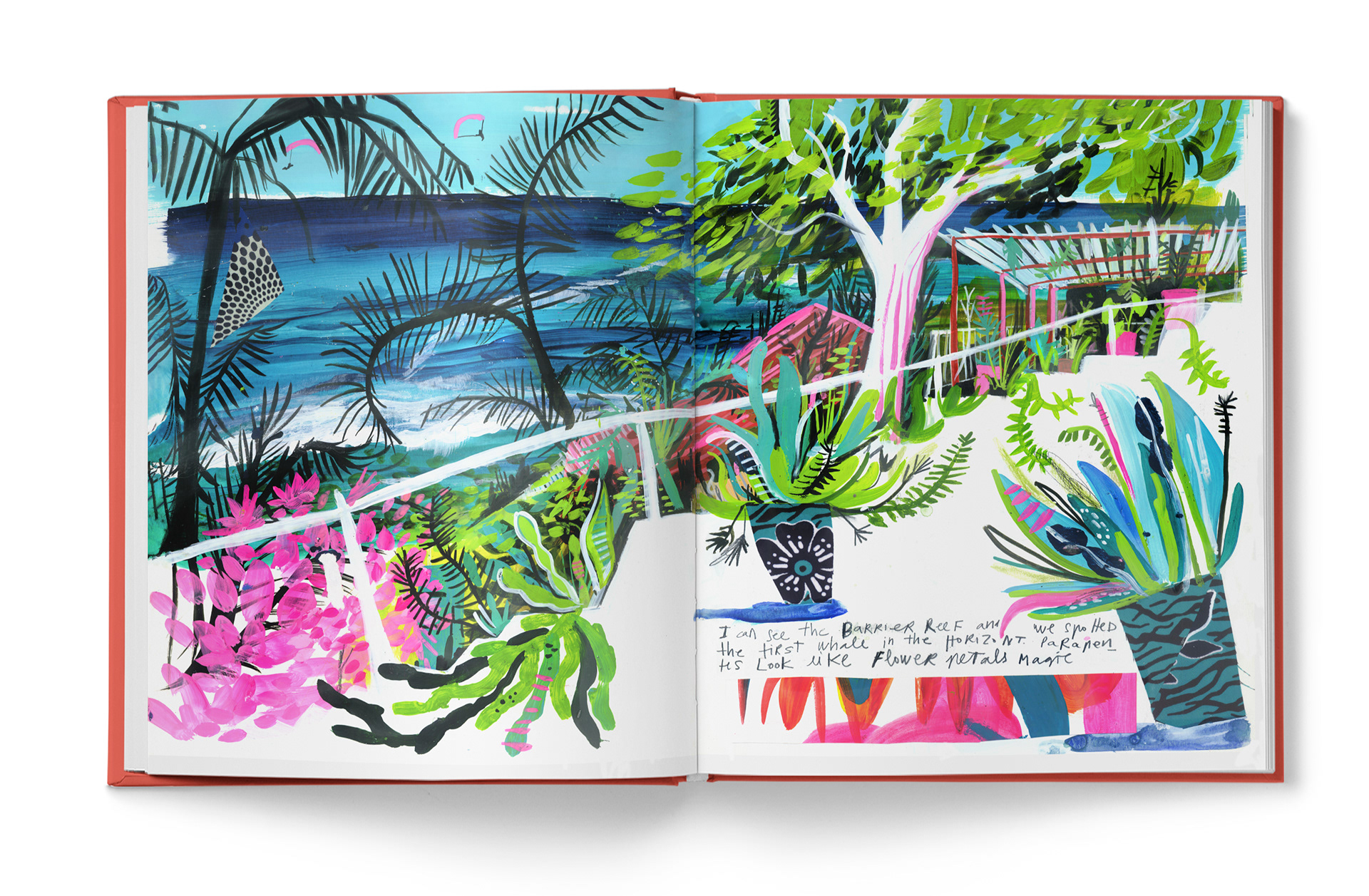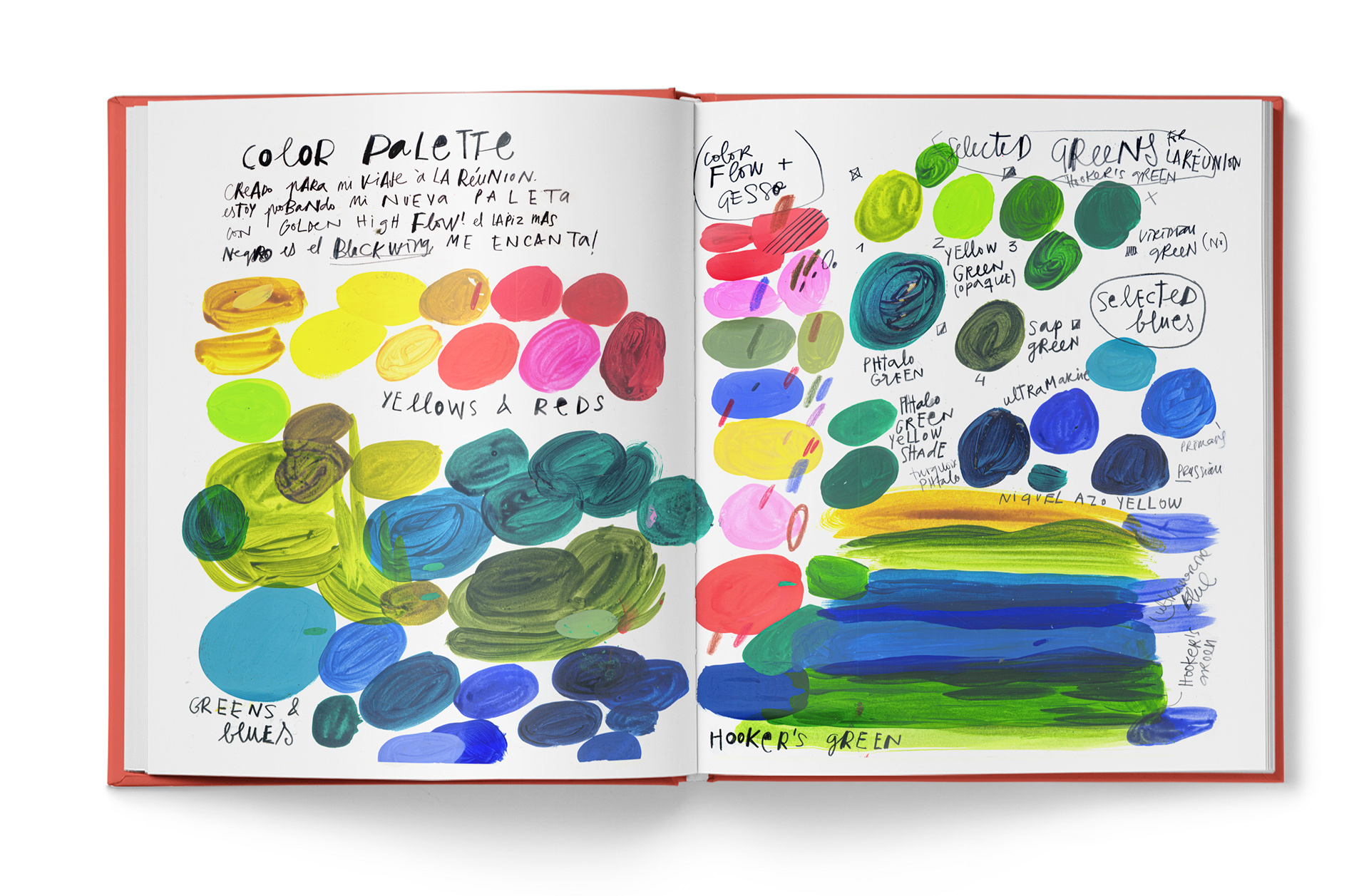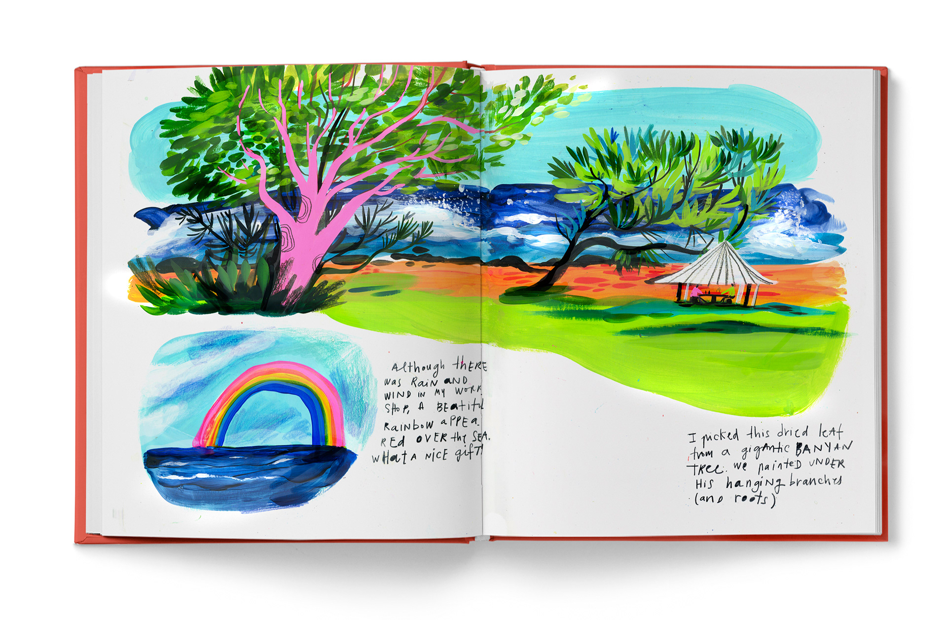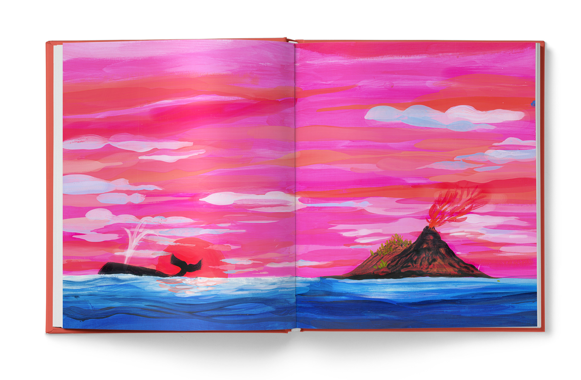The drawings are based on direct observation: landscape, people, markets, the island’s colors, plants from the species conservatory, a créole house, fruits, the excursion to Îlet Boulon, and the Piton de la Fournaise volcano. There is also a double spread dedicated to the skies, which are especially intense and constantly changing.