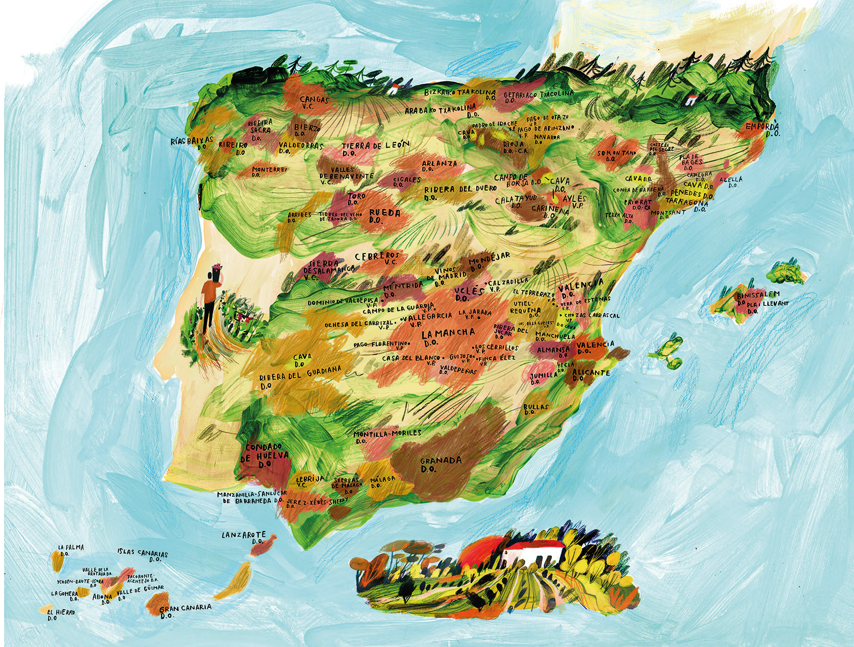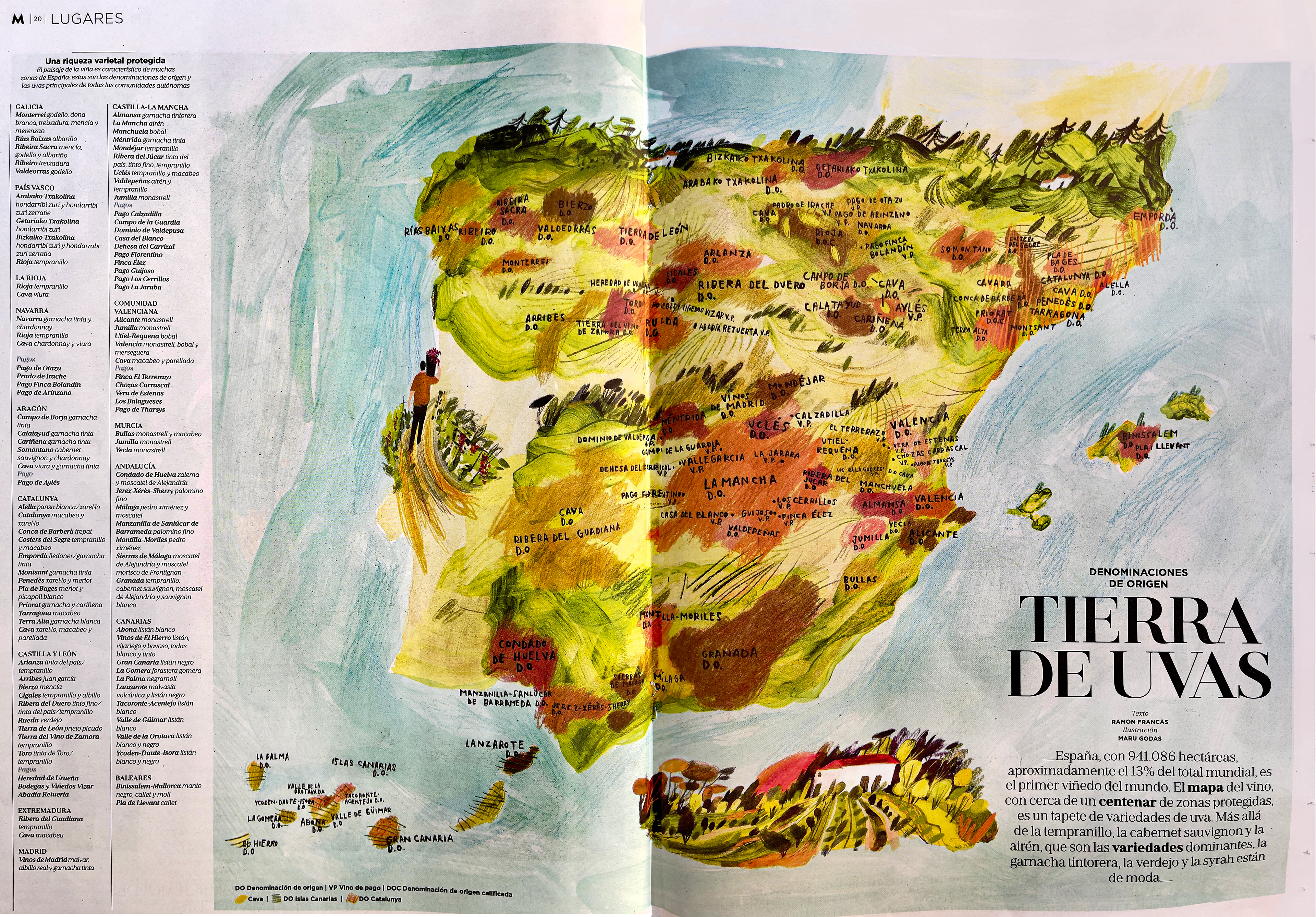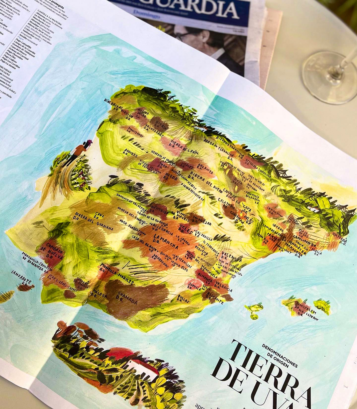 For the special issue dedicated to wine, I created this map of the denominations of origin across Spain. The piece was entirely handmade, combining acrylic paint and mixed media techniques to emphasize gesture and the material quality of the mark.